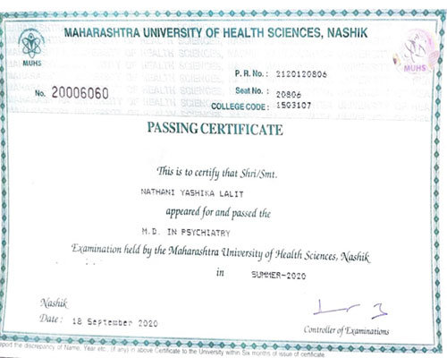 - N.K.P Salve Institute of Medical Sciences and Research Center, Lata Mangeshkar Hospital -Nagpur, Maharashtra, India.-M.D. Psychiatry,